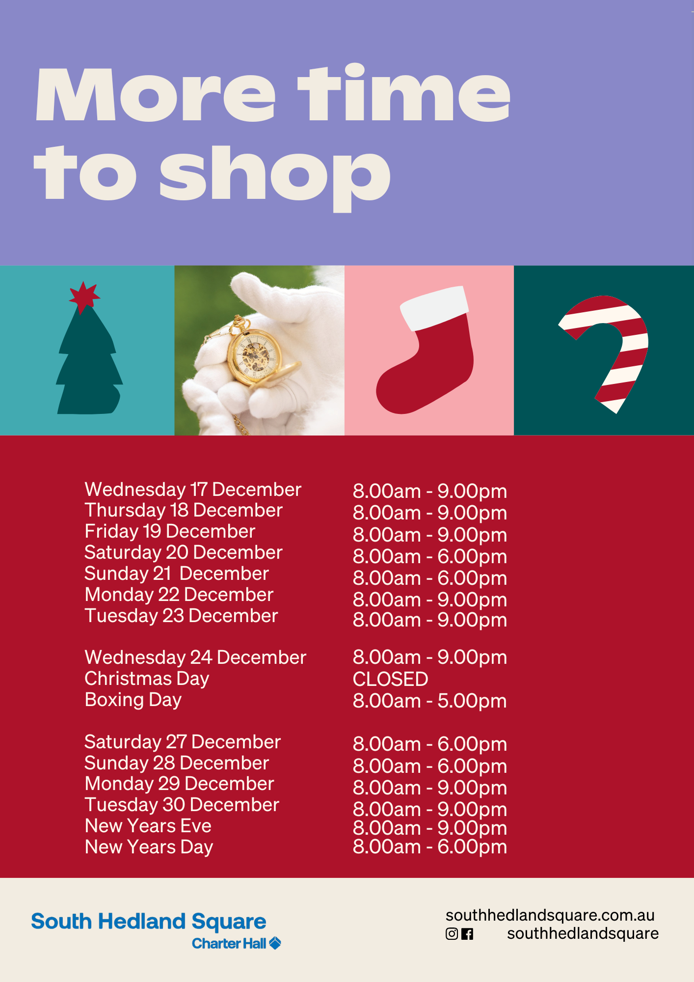 This festive season, we’re giving you the gift of time. With extended trading hours at South Hedland Square, you can shop at your own pace.